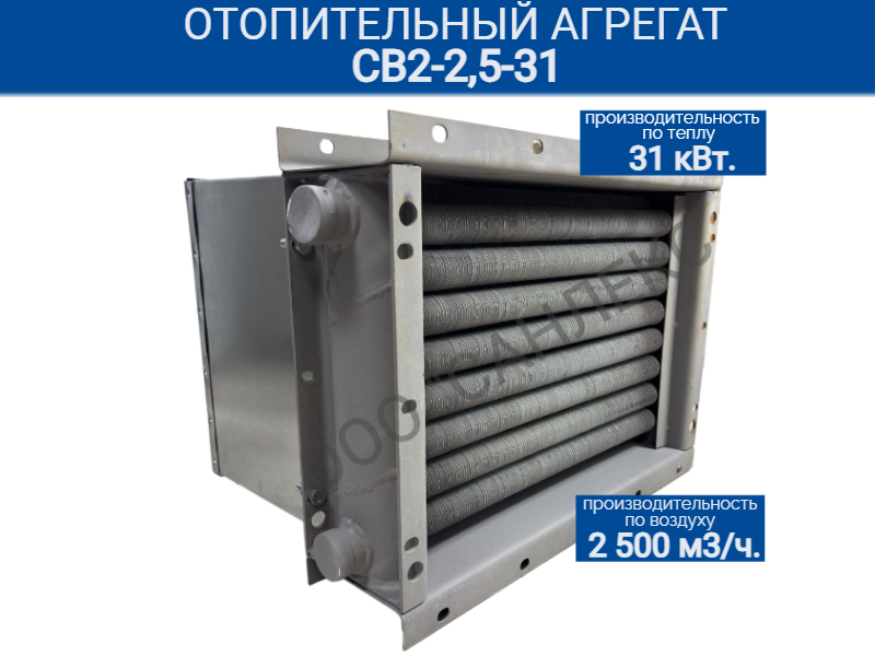 Отопительный агрегаты СВ имеют стальной калорифер с алюминиевым оребрением, что отличает их высокой теплоотдачей и большим сроком службы. В линейке присутствуют агрегаты на базе 2-х, 3-х, 4-х рядными калориферами.