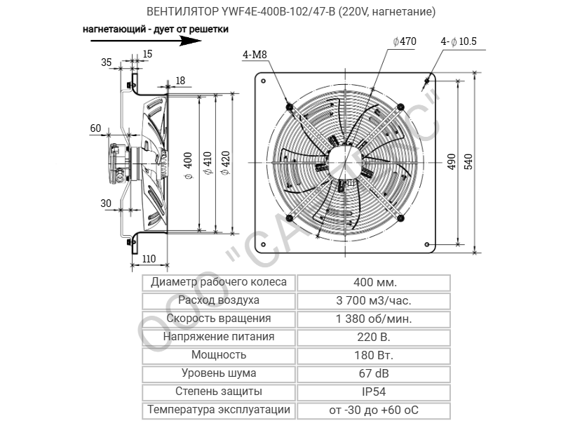 - Диаметр лопастей: 400 мм, что позволяет создавать мощный поток воздуха для вентиляции больших пространств.